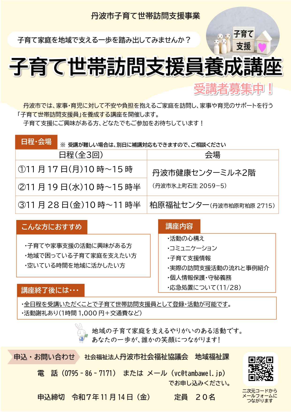 丹波市社会福祉協議会では、家事・育児に対して不安や負担を抱えるご家庭を訪問し、家事や育児のサポートを行う「子育て世帯訪問支援員」を養成する講座を11月に全3回で開催します。
